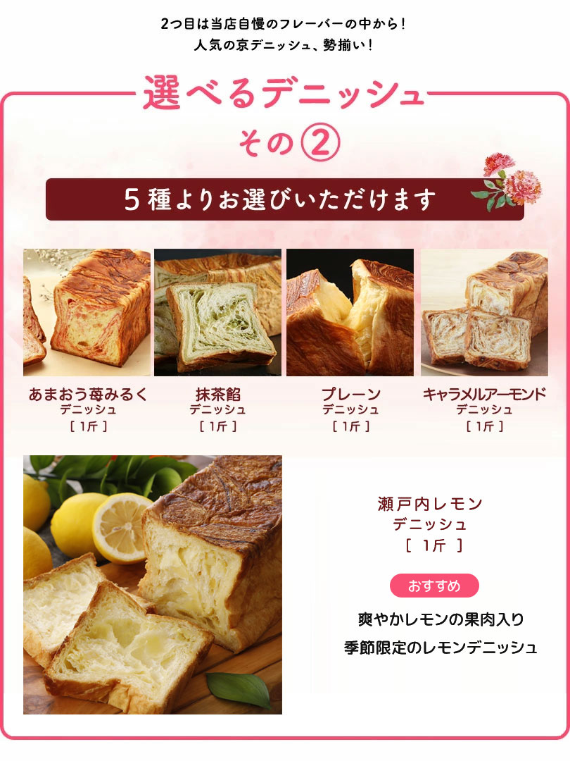 【5/6(水)お届け】【早割!4月末まで】母の日 2026送料無料 選べるデニッシュ2本セット化粧箱入 ミニカーネーション付 送料無料